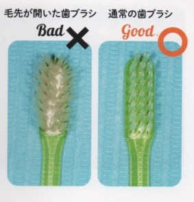 「かため」毛先が開いた歯ブラシは歯の平面に付着したプラークを除去する力は強いですが、歯ぐきにはやさしくありません。また、歯ブラシの毛先は開いていないかにも気をつけましょう。