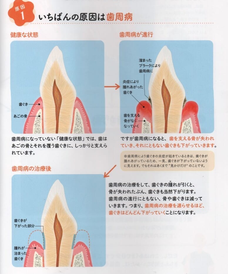 歯ぐきが下がるいちばんの原因は歯周病です。