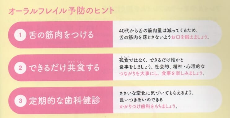こうして、オーラルフレイルは身体的・社会的フレイルへとつながっていき、結果として要介護状態となるリスクを高めます。